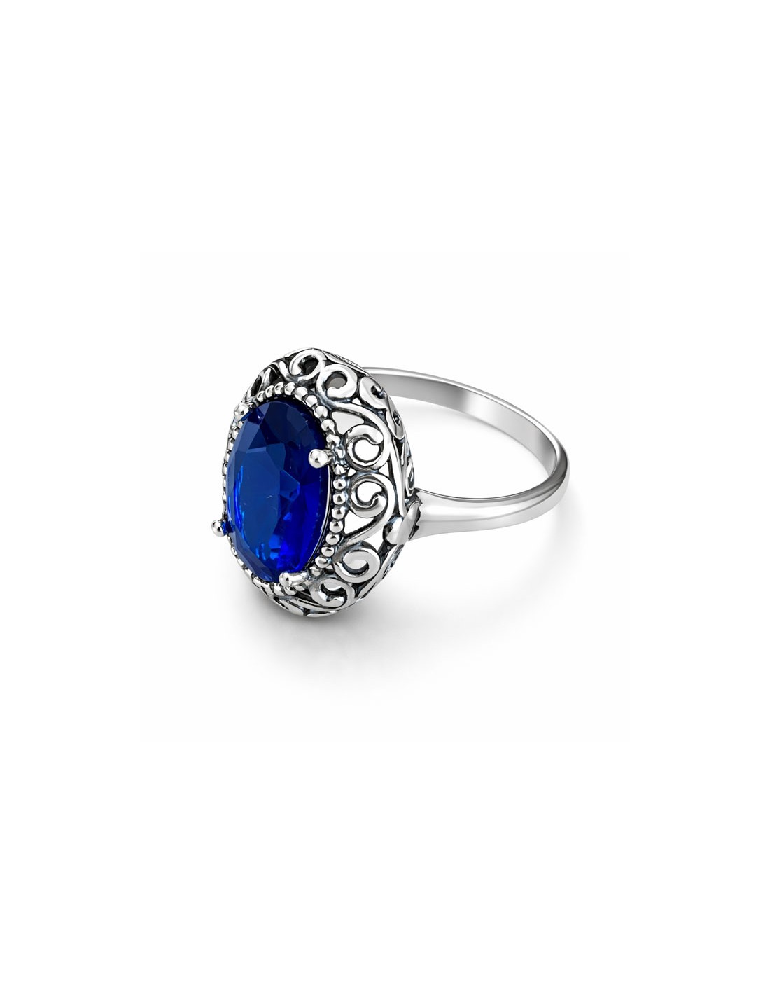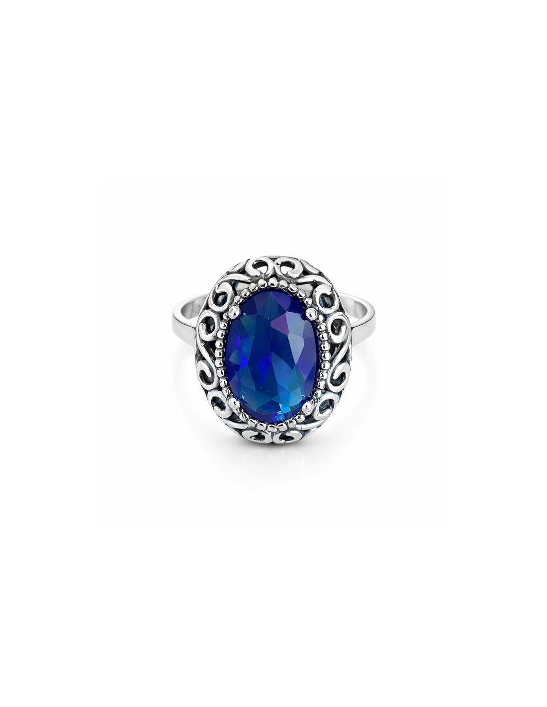 Centralnym elementem pierścionka jest olśniewający kryształ w kolorze Sapphire, którego głęboki, szlachetny odcień niebieskiego przyciąga spojrzenia i pięknie współgra ze srebrem. Kamień osadzony został w dekoracyjnej, misternie zdobionej oprawie o ażurowym wzorze, podkreślającym wyjątkowy charakter projektu.