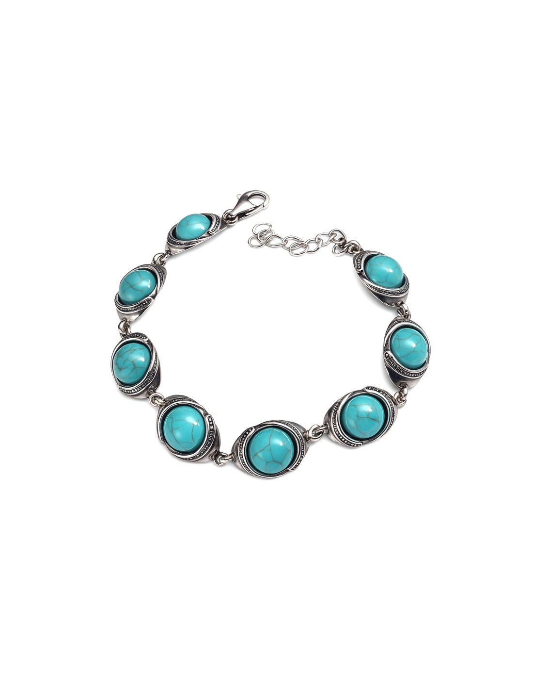 Srebrna bransoletka, której ogniwa stanowią turkusy, z których każdy oprawiony jest ciekawym srebrnym motywem. Połączenie to sprawia iż wyróżnia się ona na tle innych wyrobów biżuteryjnych. Jest oryginalna a jednocześnie jej wzór jest ponadczasowy - będzie świetnym dodatkiem zarówno do eleganckich jak i codziennych stylizacji. Niewątpliwie przykuwa wzrok i zachwyca starannym, precyzyjnym wykonaniem. Elegancji dodaje wyrazistość kamienia jakim jest turkus. Srebro próby 925.