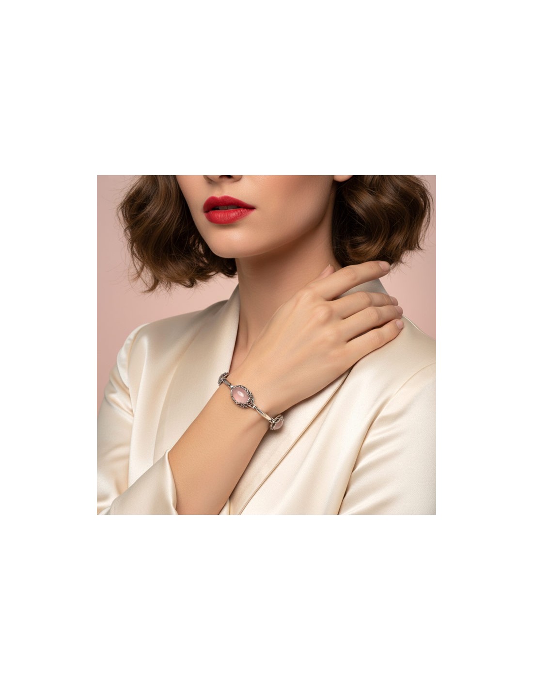 Odkryj urok delikatności i ponadczasowej elegancji w naszej srebrnej bransoletce z naturalnym kwarcem różowym. Ten finezyjny model, utrzymany w estetyce klasycznej kolekcji, zamienia siłę natury w wyrafinowaną formę biżuterii. Bransoletka jest doskonałym wyborem dla tych, którzy poszukują dodatku łączącego lekkość z wyrazistym charakterem i pozytywną energią.
