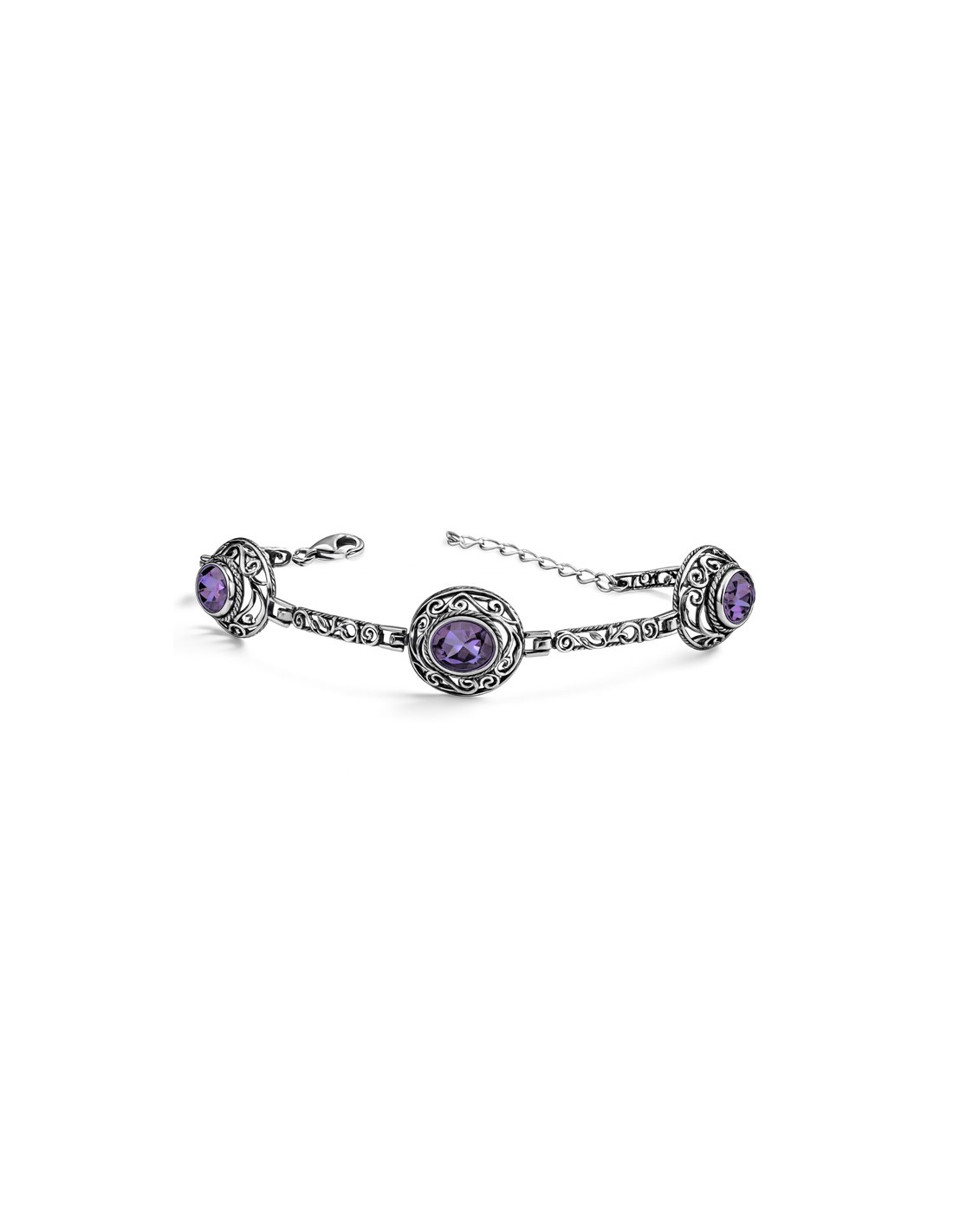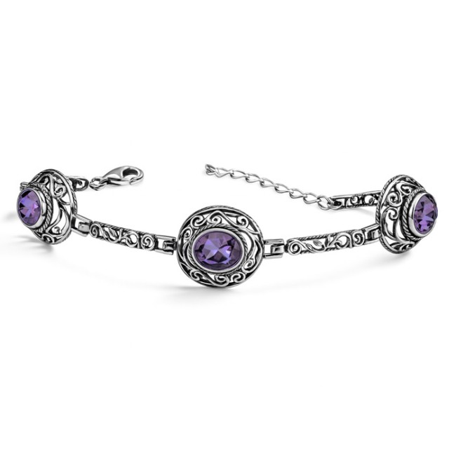 Bransoletka wykonana została z srebra próby 925, które poddano procesowi oksydacji, nadając mu charakterystyczny, matowy odcień. Kontrast między ciemnym srebrem a pięknymi kryształami w kolorze lawendowym tworzy harmonijną kompozycję, która przyciąga wzrok swoją subtelnością i elegancją.