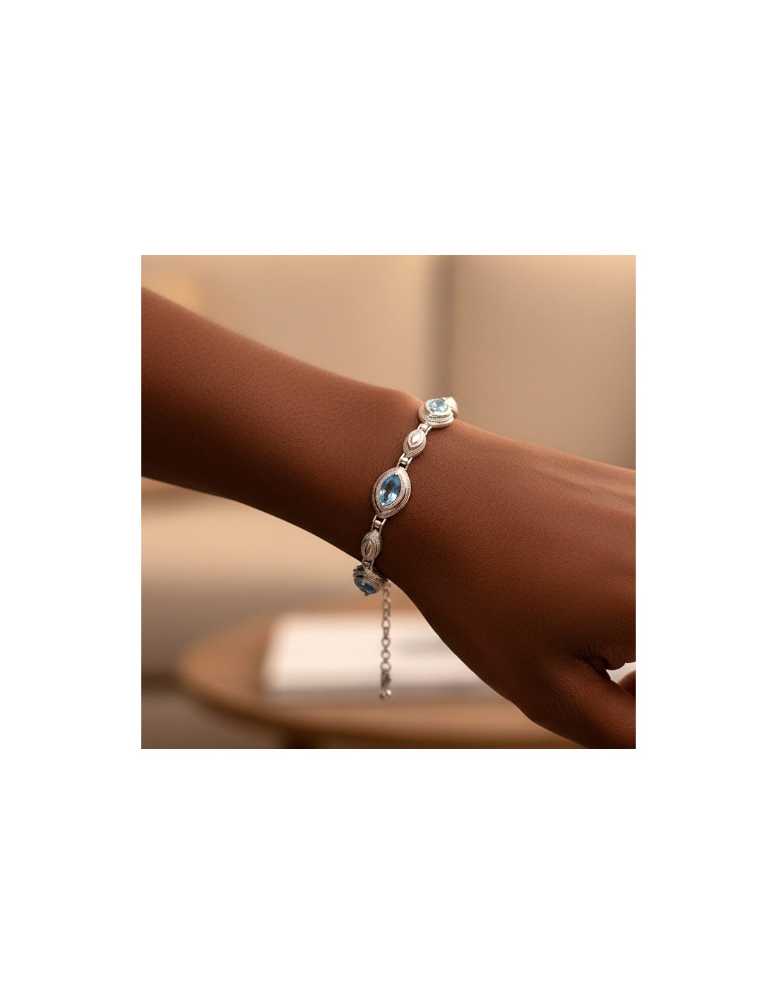 Bracelet with Swarovski crystals in blue (Aquamarine), navy blue (Montana), salmon (Rose Peach) or pink (Fuchsia). Like all items in our shop, it is made of 925 silver. Rhodium-plated product - this protects the silver from darkening and the bracelet will retain its appearance for years. The silver, delicate setting of the crystals draws attention, which extremely emphasizes and brings out their beauty. The jewelry will certainly catch the eye and will not go unnoticed. It will adorn the hand of every owner without exception. It is possible to buy earrings on a "long" or "short" clasp, a pendant and a ring to the set.