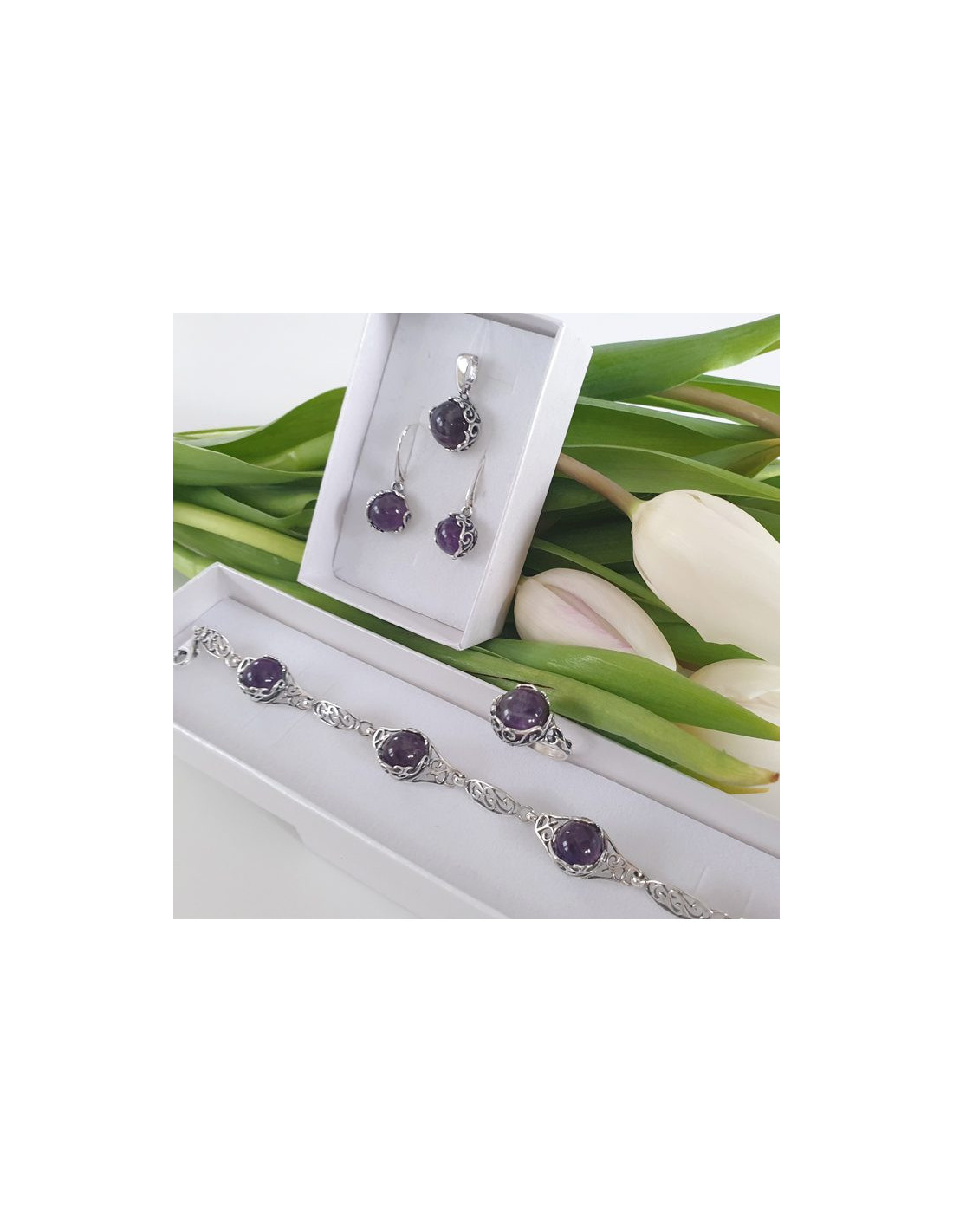 Natural amethyst stone in a beautiful silver setting with an openwork motif.