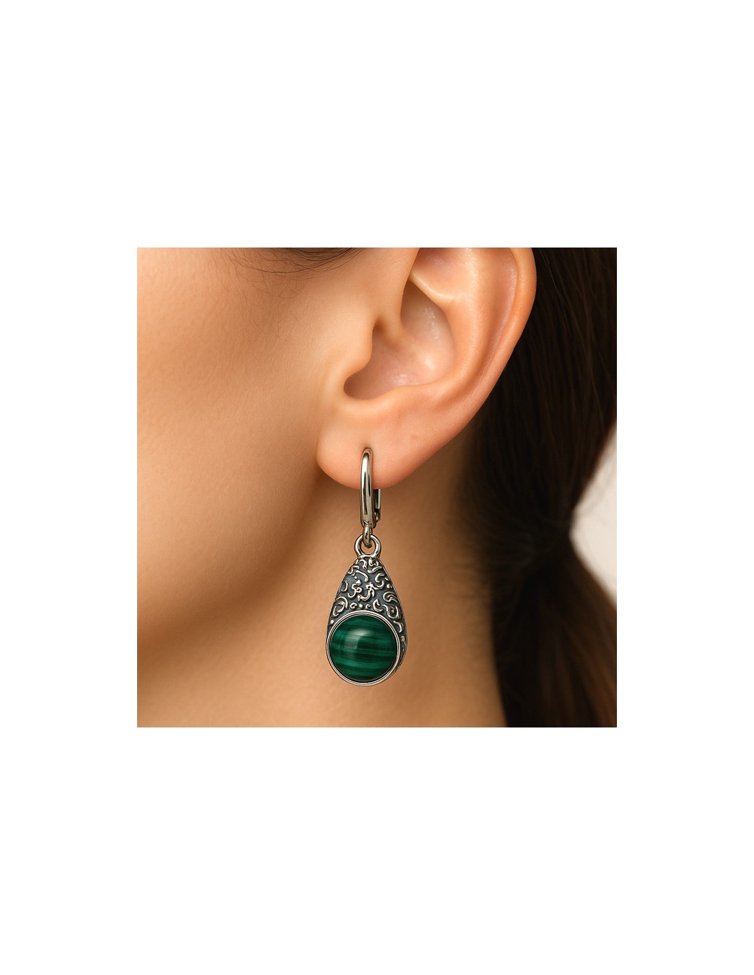 Silver, oxidized earrings decorated with malachites. Jewelry made of 925 silver, with an interesting pattern. In this case, these are hanging silver earrings on hanging English clasps. They can be matched with a pendant and a ring. We also offer a version of an earring on short English clasps. Malachite is a mysterious stone, so it will add interest, style and sometimes a necessary edge to any outfit ;) A beautiful combination of green and black. Regardless of whether it is a colorful/green dress or a subdued, e.g. white suit, it should fit in perfectly. Good for special events, but will also work well in everyday use. If we are looking for earrings for a gift, this will be a good option - packed in a decorative box.