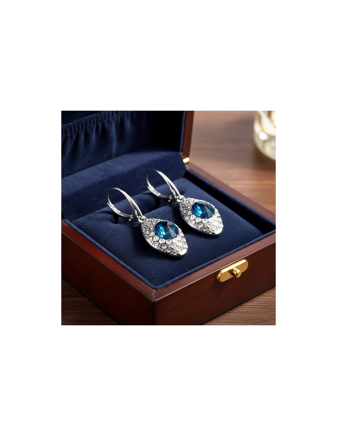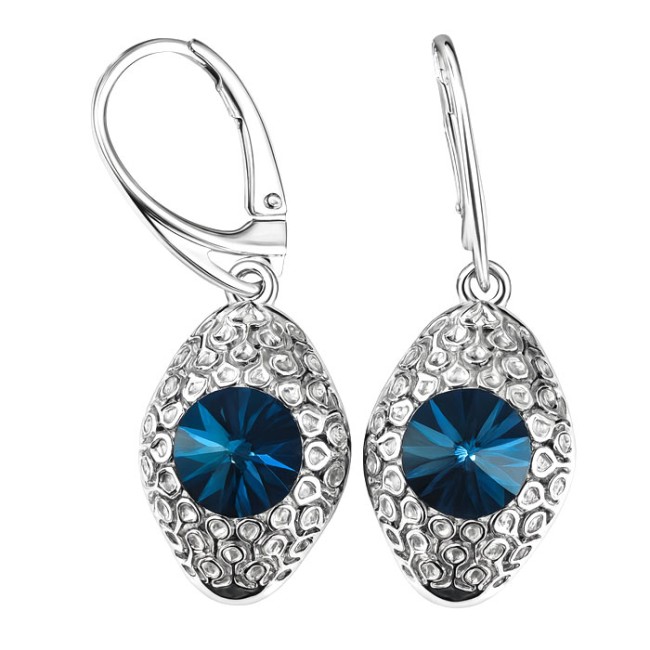 Earrings with Swarovski crystals in one of three color variants - in a shade of white (Crystal), blue (Aquamarine) or navy blue (Montana). Like all items in our store, they are made of 925 silver. Rhodium-plated product - this protects the silver from darkening and the earrings will retain their appearance for years. One of the most interesting and longest-developed designs. The silver setting of the crystals draws attention - the holes in it are so small that they can only be seen against the light - it gives the illusion as if the crystals were surrounded by diamonds - while in reality it is an extremely delicate lace-cut pattern in silver. It is possible to buy a pendant and a ring to complete the set.