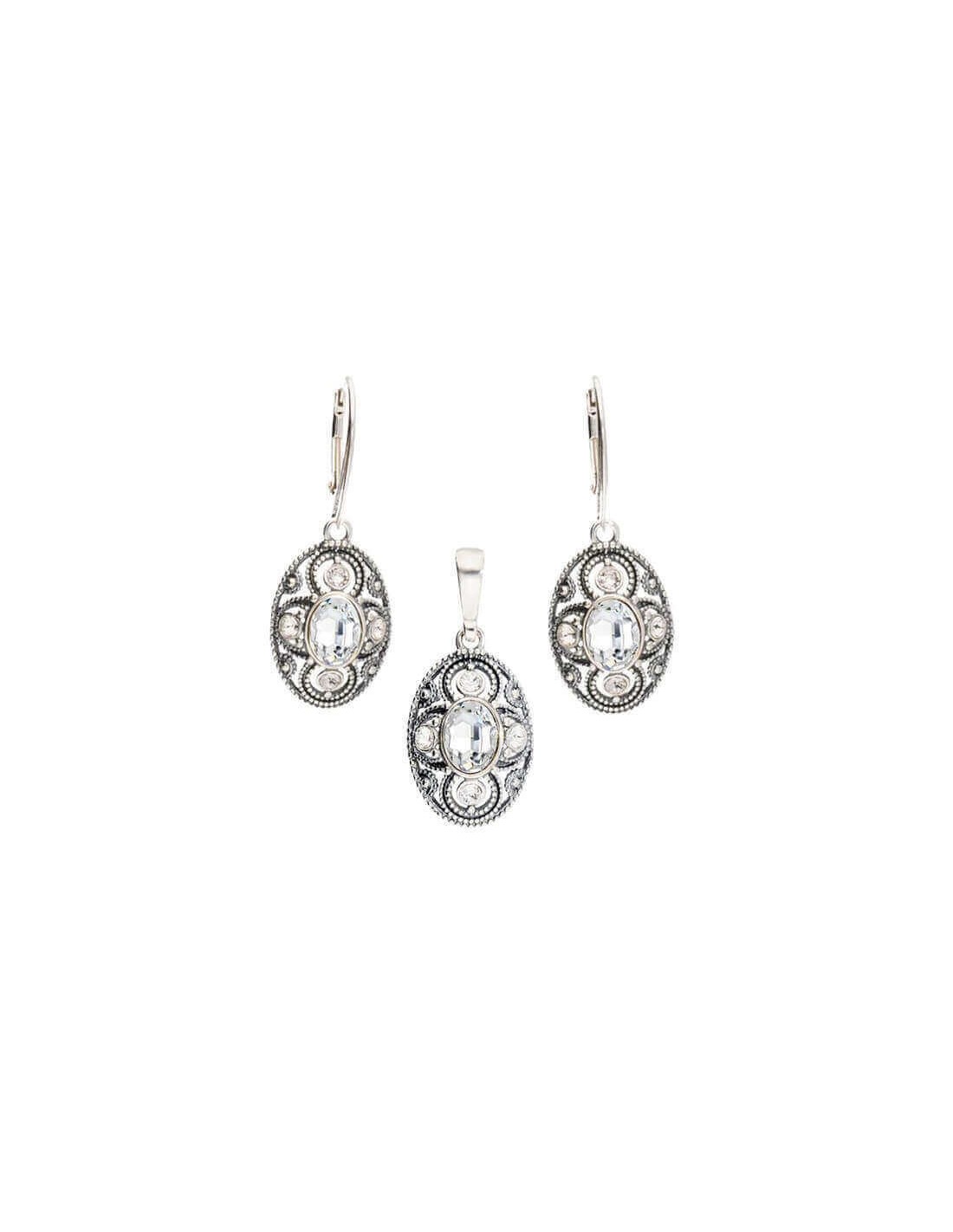 Silver, oxidized pendant decorated with Swarovski crystals. Precisely made, classic style of the pendant. 925 silver. The set includes an earring, bracelet and ring.