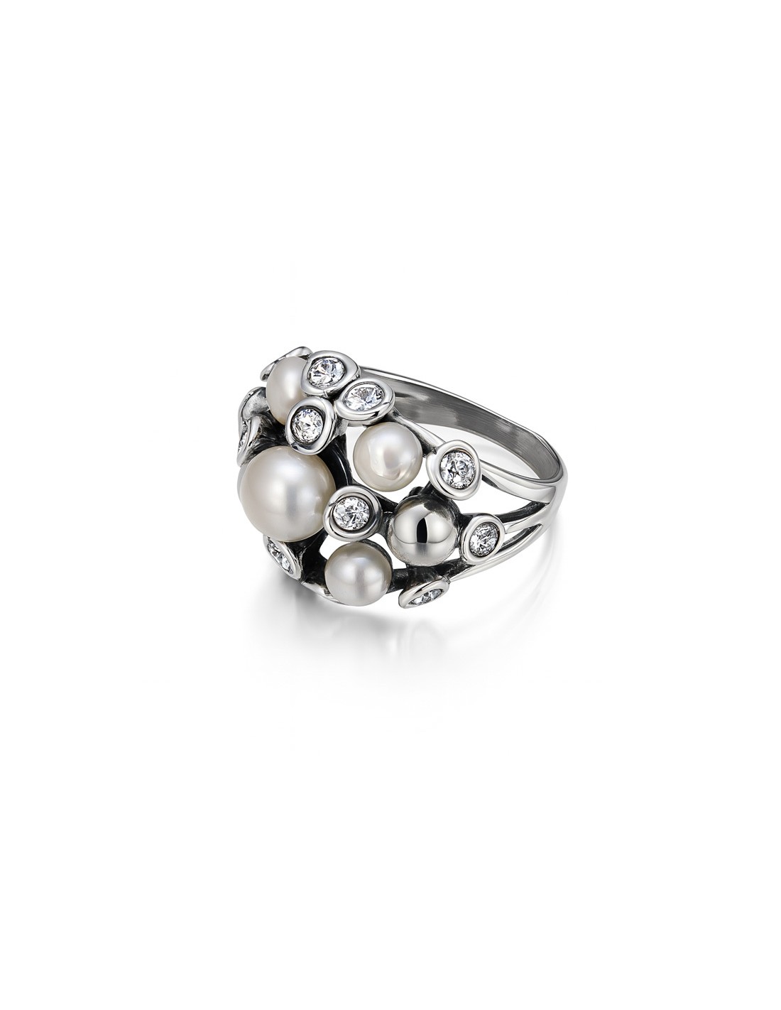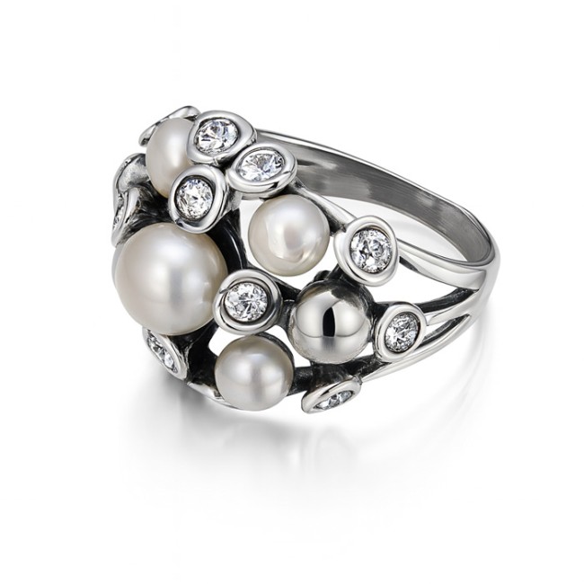 A delicate silver motif combined with a pearl and Swarovski crystals create a ring that will attract everyone's attention when worn on the finger. A beautiful and effective pattern, decorated with many pearls and Swarovski crystals.