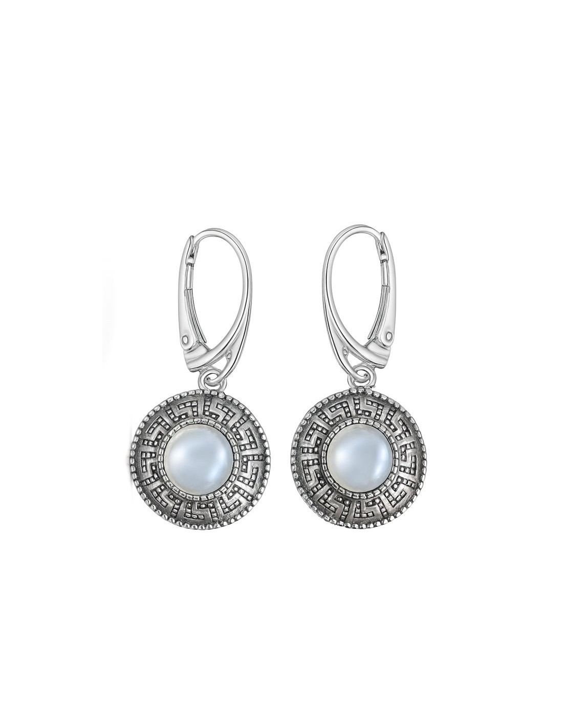 Oprawa kolczyków przyciąga uwagę dekoracyjnym wzorem inspirowanym motywem greckiego ornamentu, który nadaje biżuterii wyjątkowy, szlachetny charakter. Geometryczne zdobienia w połączeniu z perłą tworzą model o ponadczasowym stylu, łączący klasykę i artystyczny detal.