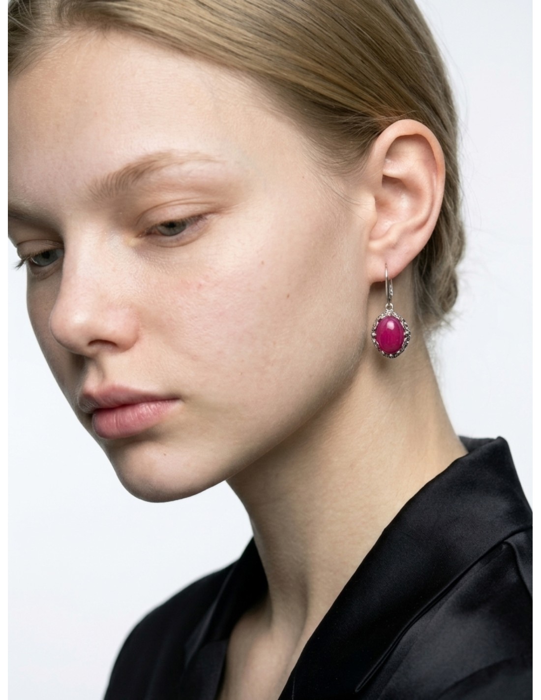 Owalne kamienie z naturalnego agatu (barwionego) przyciągają uwagę intensywną, malinową barwą. Ich gładka powierzchnia pięknie odbija światło, dzięki czemu kolczyki delikatnie mienią się przy każdym ruchu. To subtelna gra światła i koloru, która dodaje twarzy blasku.