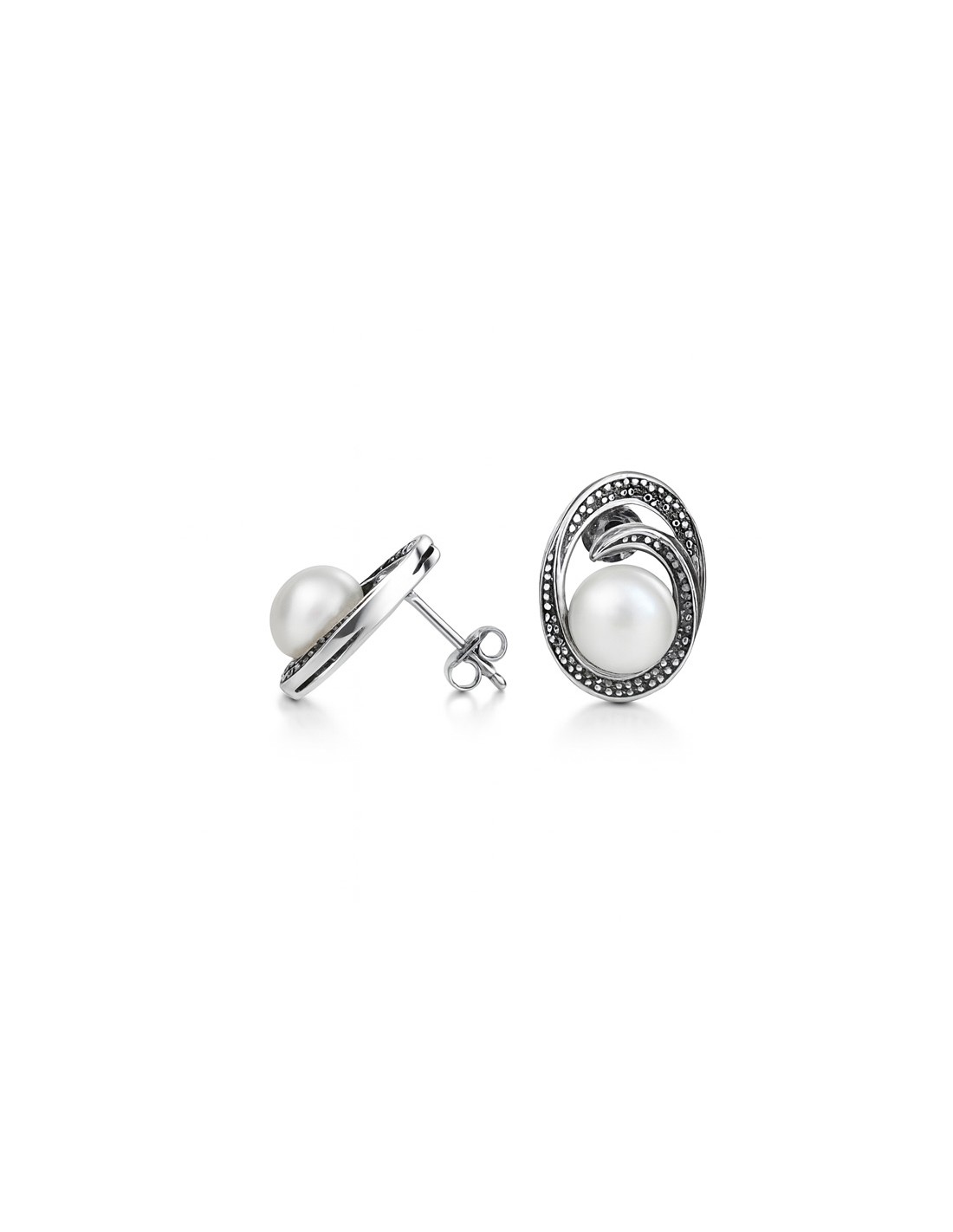 Kolczyki wykonane zostały z wysokiej jakości srebra próby 925, które zostało częściowo oksydowane, aby wydobyć strukturę zdobień i nadać całości eleganckiego charakteru. Centralnym elementem kompozycji jest perła hodowlana o gładkiej, satynowej powierzchni, która pięknie odbija światło i subtelnie rozświetla twarz.