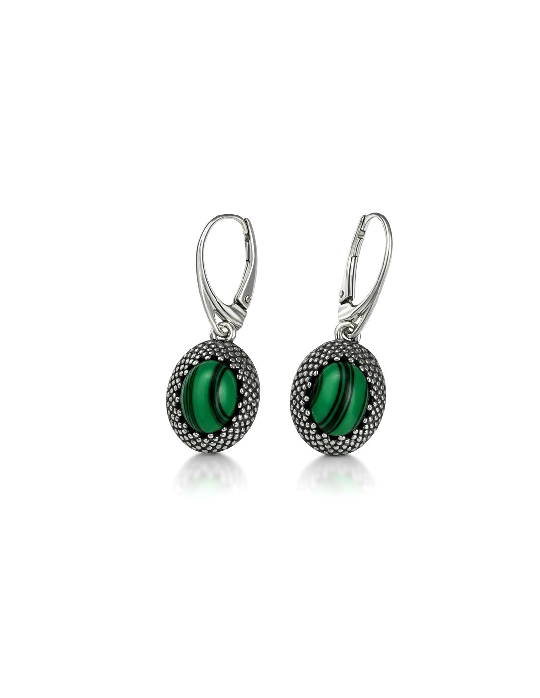 Każdy z tych kolczyków zdobi starannie wyselekcjonowany, rekonstruowany malachit, którego wzór koncentrycznych pierścieni i głębokich zieleni został odtworzony z niebywałą wiernością naturze. Dzięki procesowi rekonstrukcji, para zyskuje doskonałą, wizualną spójność, a każdy kamień zachwyca intensywnością barwy i wyraźnym, artystycznym deseniem. Oprawa z przyciemnionego, oksydowanego srebra próby 925 nie rywalizuje z kamieniem, a jedynie go obramowuje. Jej głęboki, szaro-grafitowy mat stanowi idealnie stonowane tło, które sprawia, że wirująca zieleń malachitu wydaje się niemal świecić od wewnątrz.