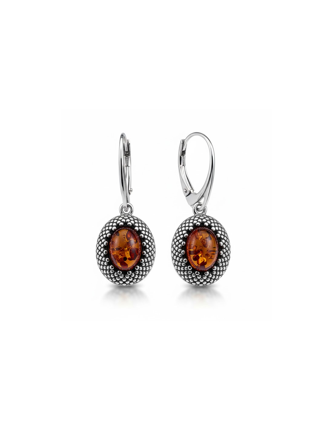 Kolczyki zostały wykonane z najwyższej jakości srebra próby 925, gwarantującego trwałość i hipoalergiczne właściwości. Srebro zostało dodatkowo poddane procesowi oksydacji, który delikatnie je przyciemnił, nadając mu głębię i vintage’owy charakter. Ten zabieg sprawia, że srebro nie jest wyłącznie tłem, ale tworzy subtelny, artystyczny kontrast, z którego jeszcze wyraziściej wyłania się główna gwiazda tej kompozycji – naturalny bałtycki bursztyn w uwodzicielskim odcieniu „koniak”.
