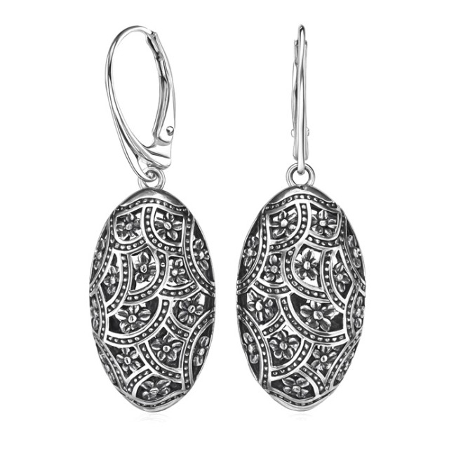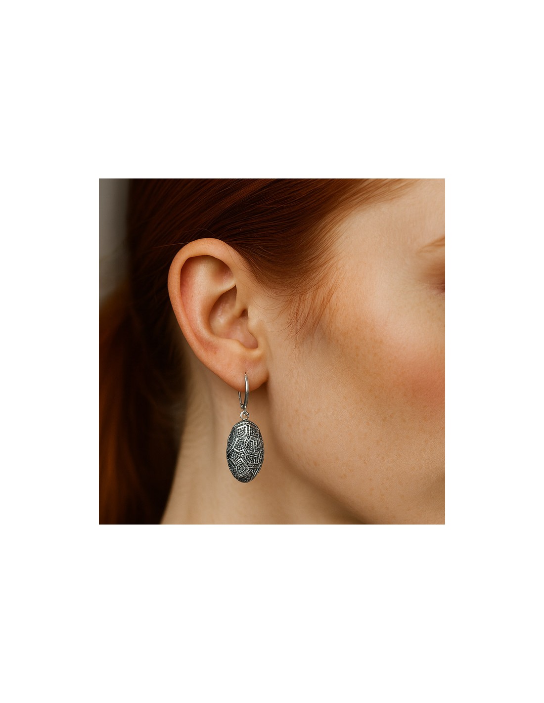 Głównym motywem tych zachwycających kolczyków jest misternie odwzorowany kwiat stokrotki – symbol niewinności, radości i prostego piękna. Technika oksydowania, polegająca na celowym przyciemnieniu powierzchni srebra, wydobywa głębię i precyzję ażurowego wzoru, nadając biżuterii wyjątkowy, vintage'owy urok. Dzięki temu każdy detal jest doskonale widoczny, a kolczyki zyskują niepowtarzalny, artystyczny wyraz.