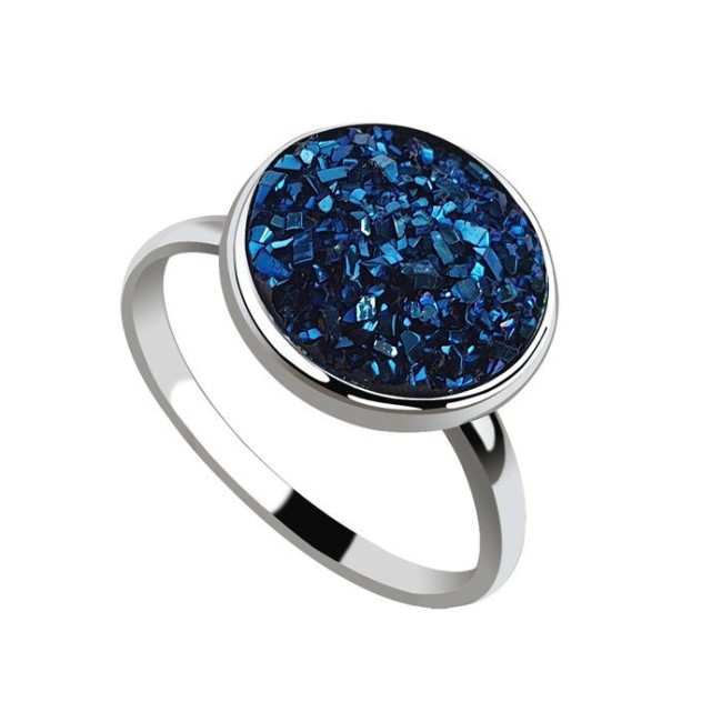 Subtelny, ciekawy i elegancki wzór to niewątpliwy atut tego srebrnego pierścionka zdobionego okrągłego kryształem szklanym druzy crystal (inaczej szkłem krystalicznym). Srebro to próba 925, idealnie łączy się z pięknym kryształem niezależnie od wybranego koloru - Aquamarine, Emerald czy Montana.