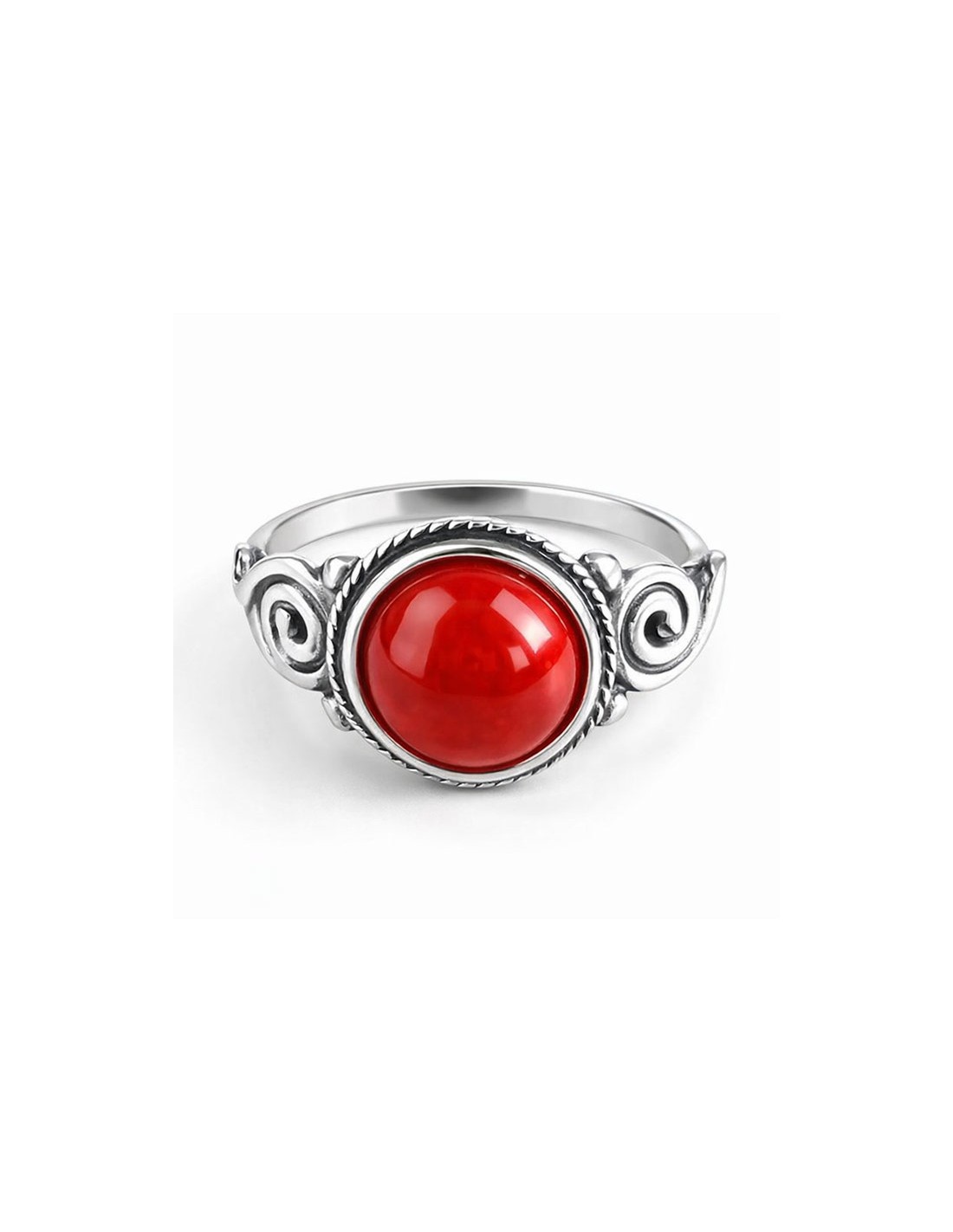 Centralnym elementem pierścionka jest rekonstruowany koral o głębokiej, nasyconej czerwieni. Kamień ten od wieków uznawany jest za symbol energii, kobiecości i elegancji. Rekonstruowana forma pozwala uzyskać jednolitą strukturę oraz spójny kolor, dzięki czemu pierścionek prezentuje się niezwykle estetycznie i elegancko. Koral został osadzony w solidnej oprawie wykonanej ze srebra próby 925, która nie tylko podkreśla jego barwę, ale także zapewnia trwałość biżuterii na lata.
