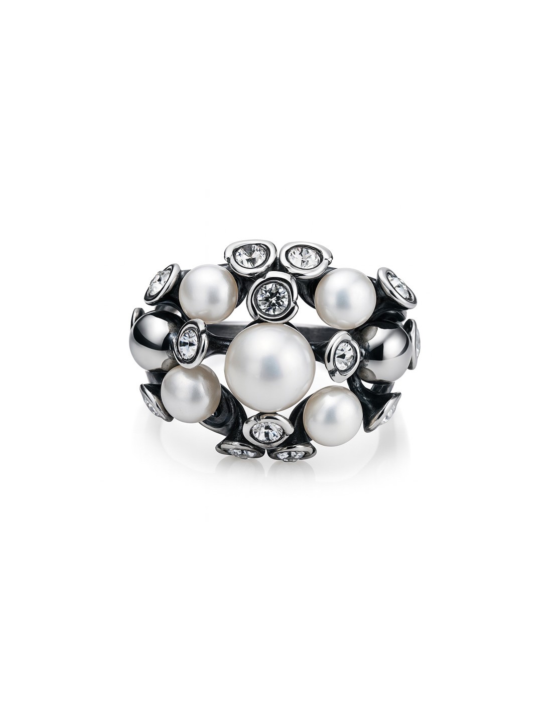 Delikatny srebrny motyw w połączeniu z perłą i kryształami Swarovskiego tworzą pierścionek, który założony na palec będzie przykuwał uwagę każdego. Wzór piękny i efektowny, zdobiony wieloma perłami i kryształami Swarovski.