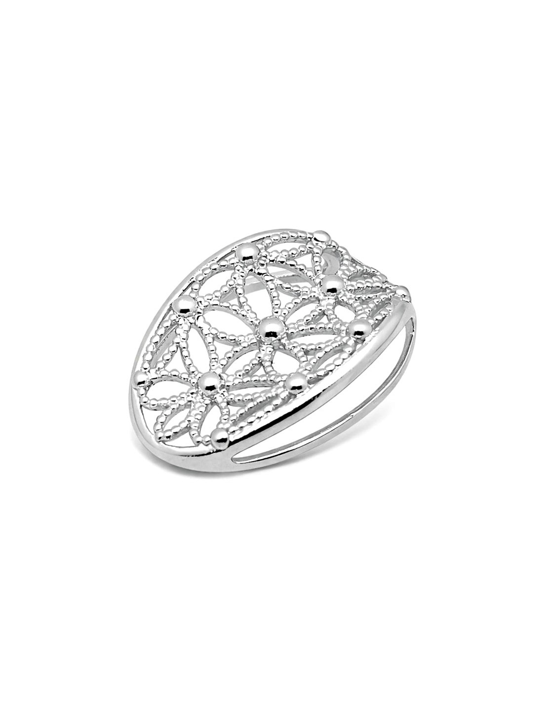 Srebrny wisiorek rodowany o owalnym kształcie i kwiecistym zdobieniu.