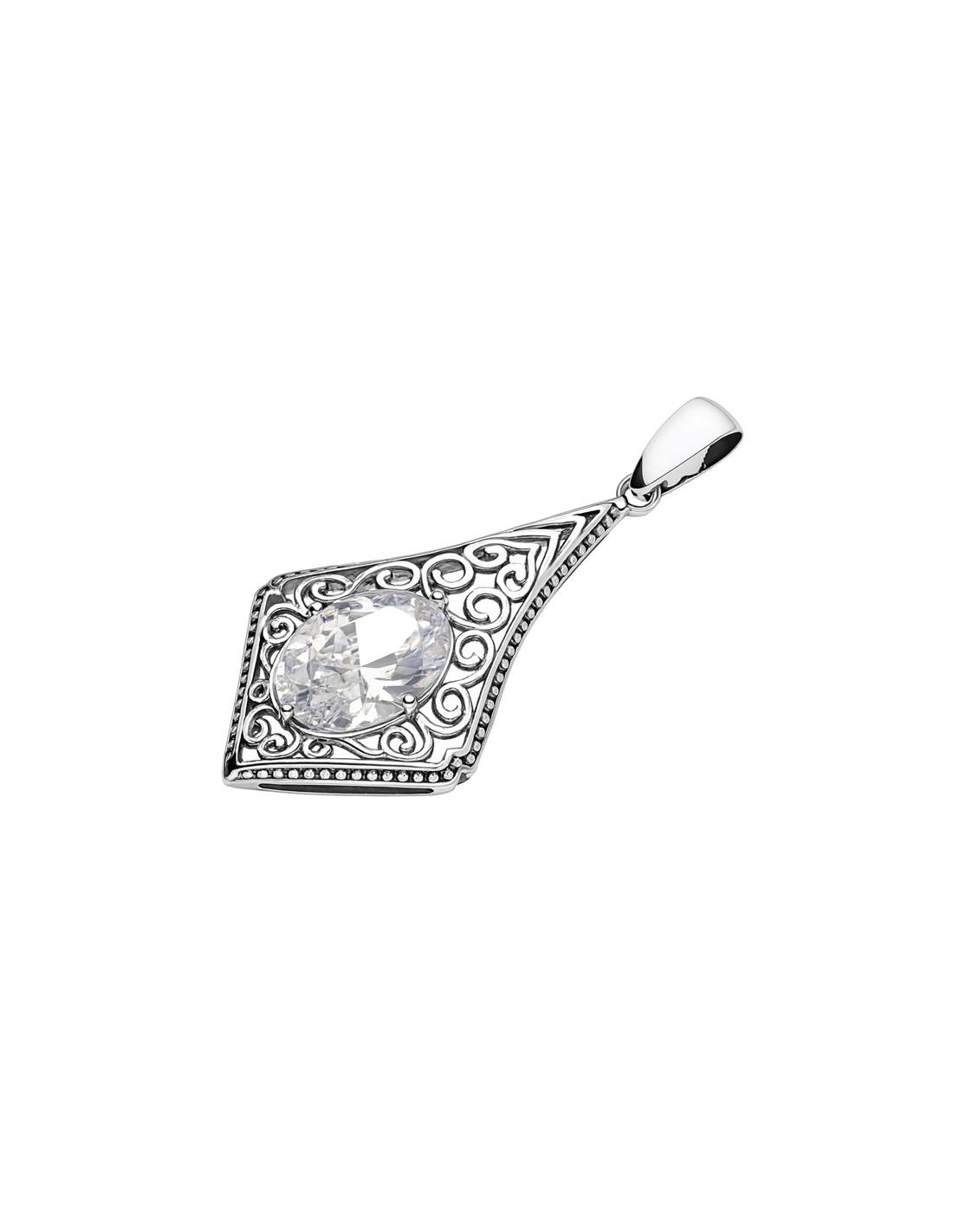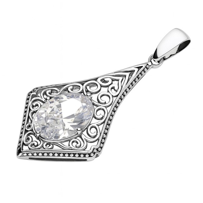 Srebrny wisiorek zdobiony cyrkonią w kolorze białym. Wykonany z dbałością o najdrobniejszy szczegół - delikatny, koronkowy motyw ze srebra w połączeniu z lśniącą cyrkonią tworzą produkt, który zawieszony na szyi będzie przykuwał uwagę każdego. Doskonale sprawdzi się zarówno przy elaganckich strojach, do których będzie świetnym dodatkiem jak i w prostych, monochromatycznych stylizacjach, w których biżuteria będzie odgrywała główną rolę.